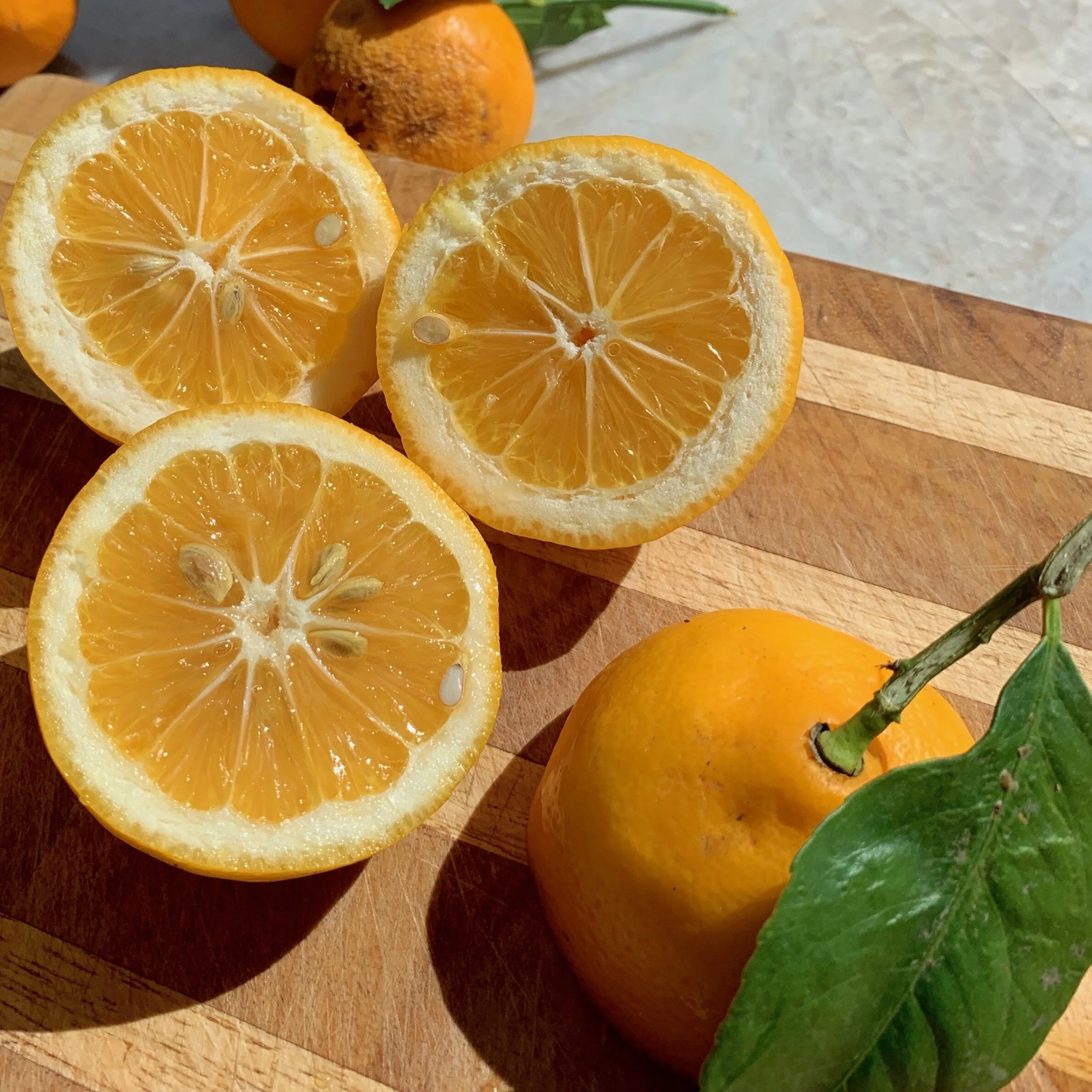 Meyer Lemons- cross between a lemon and an orange. Not as harsh as a lemon. Will add a sweet lemon flavor